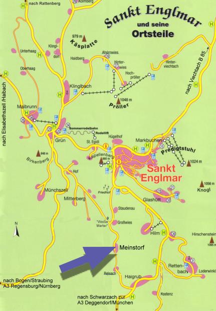 Anreise mit Pkw: Aus Richtung München A 92 bis Deggendorf, dann A 3 Richtung Regensburg bis Abfahrt Schwarzach/Sankt Englmar, anschl. 17 km nach Sankt Englmar. Aus Richtung Nürnberg A 3 - Regensburg - Straubing - Abfahrt Bogen/Sankt Englmar, anschl. 17 km nach Sankt Englmar. Aus Richtung Berlin A 9 Bayreuth Abfahrt Grafenwöhr auf B 85 über Amberg - Schwandorf - Cham - Viechtach hier Abfahrt, anschl. 11 km nach Sankt Englmar. |